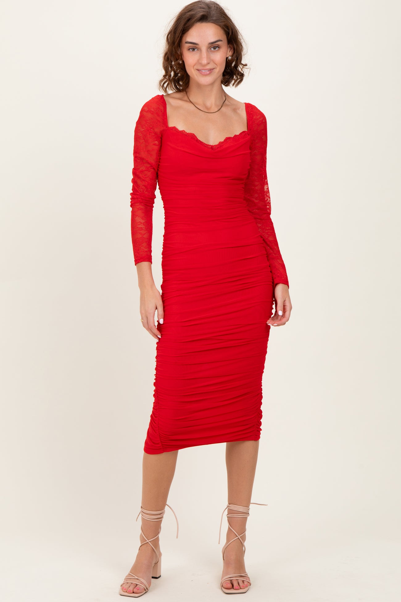 Red Ruched Lace Sleeve Midi Dress