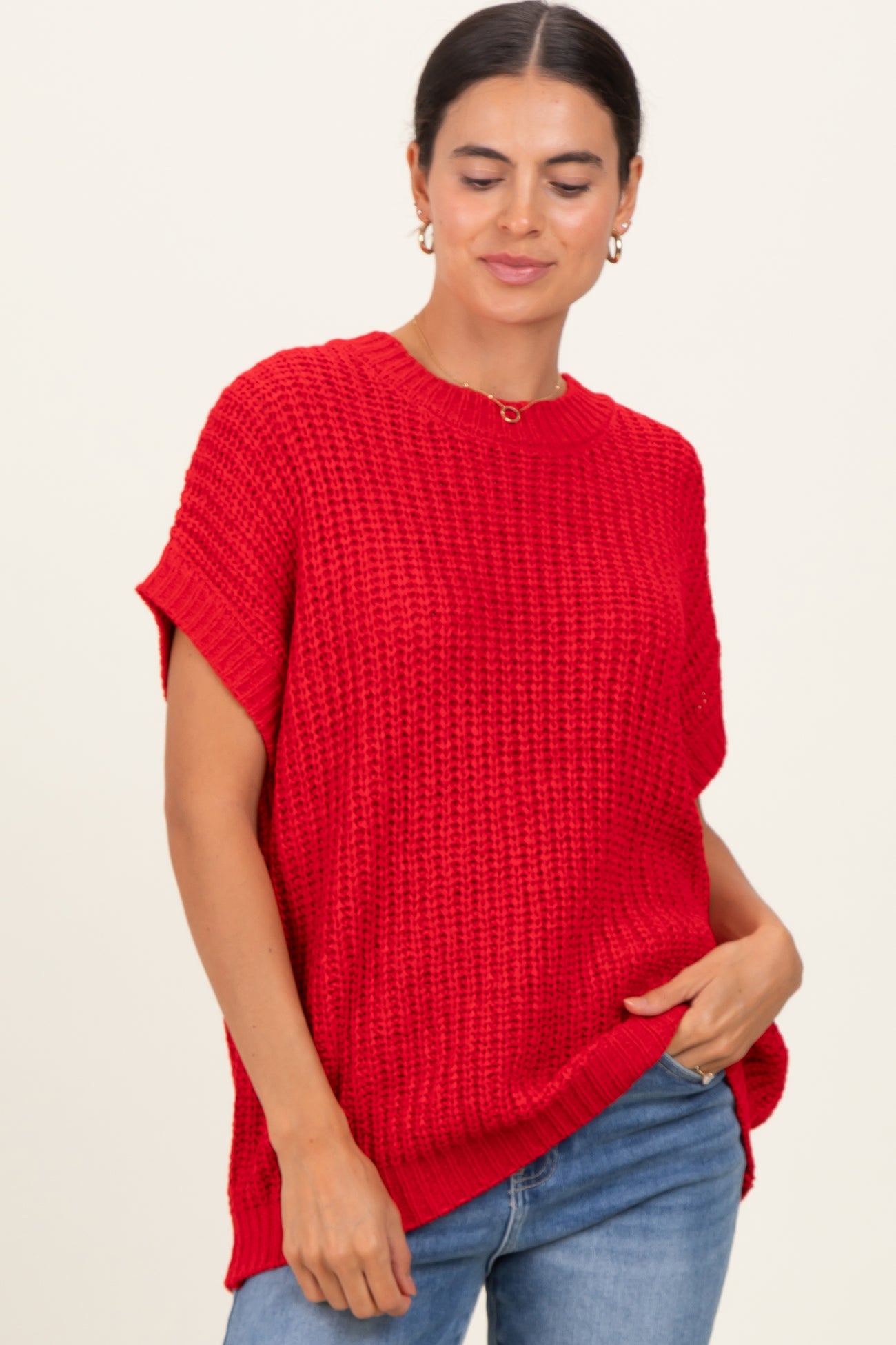 Elevate your casual wardrobe with this vibrant Red Short Sleeve Round Neck Sweater. Crafted from a cozy, textured knit, it offers a relaxed fit perfect for layering or wearing on its own. The bold red hue adds a pop of color to any outfit, while the round neckline and short sleeves keep it breathable and stylish. Pair it effortlessly with jeans or skirts for a chic, laid-back look that’s perfect for any season. Comfortable, trendy, and versatile, this sweater is a must-have staple for your collection. Available in multiple sizes to suit your style and fit.