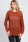 A soft chenille, open knit sweater. Features a ribbed rounded neckline, long sleeves, and a ribbed hem.