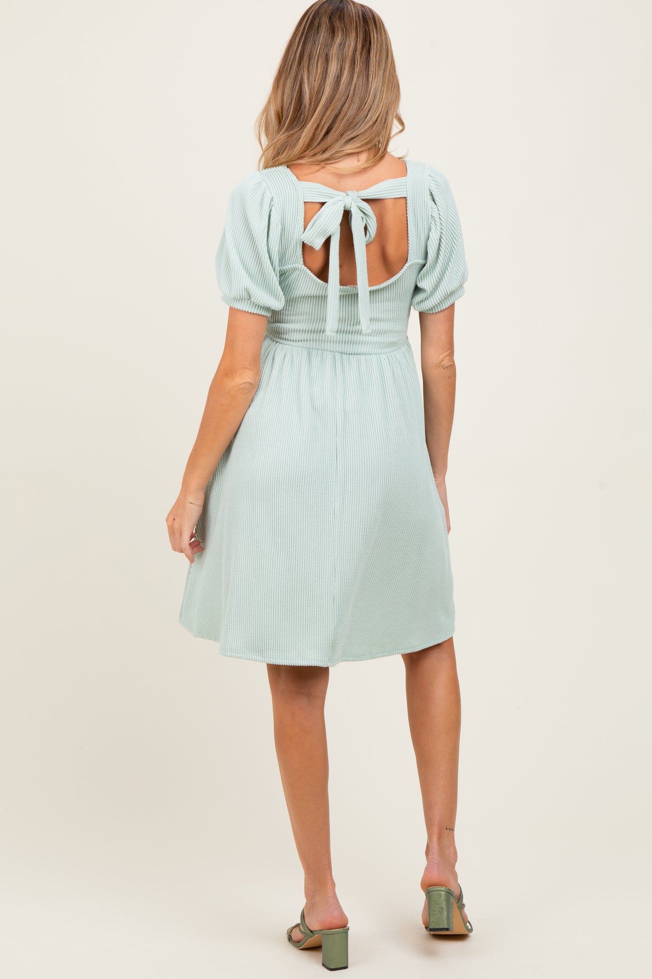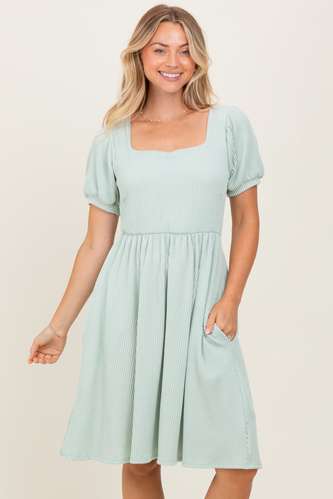 Sage Square Neck Puff Sleeve Rib Babydoll Maternity Dress