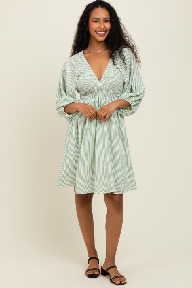 Sage Striped Balloon Sleeve V-Neck Maternity Dress