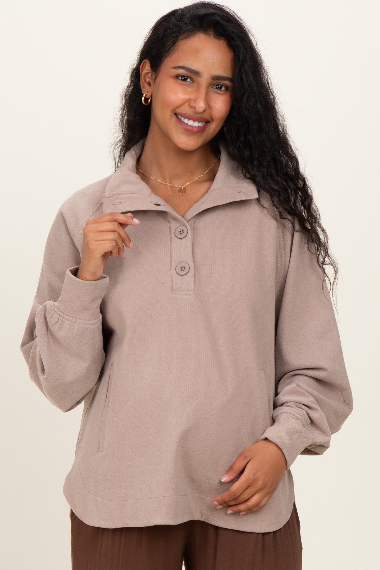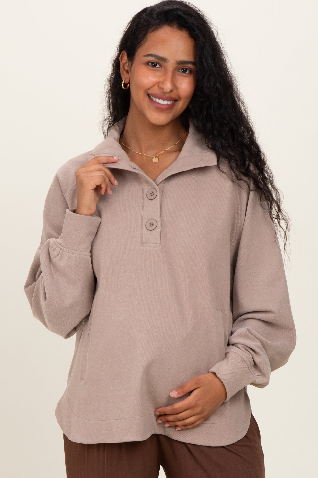 Taupe Brushed Knit Button Collar Maternity Pullover