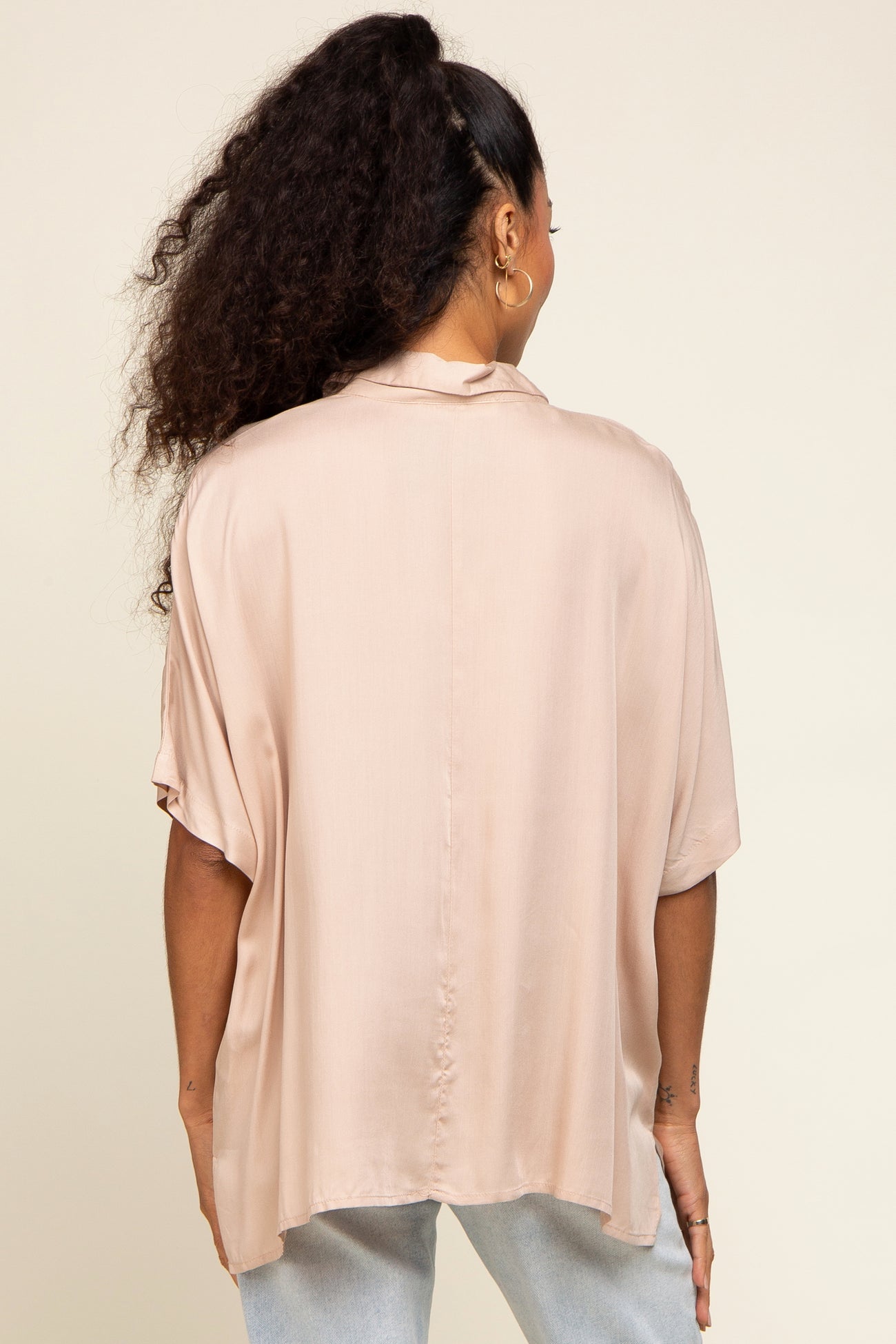 A solid hue button up top. Features a collar, front functioning buttons, short dolman sleeves, and side slits at the hem.