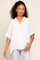 A solid hue button up top. Features a collar, front functioning buttons, short dolman sleeves, and side slits at the hem.