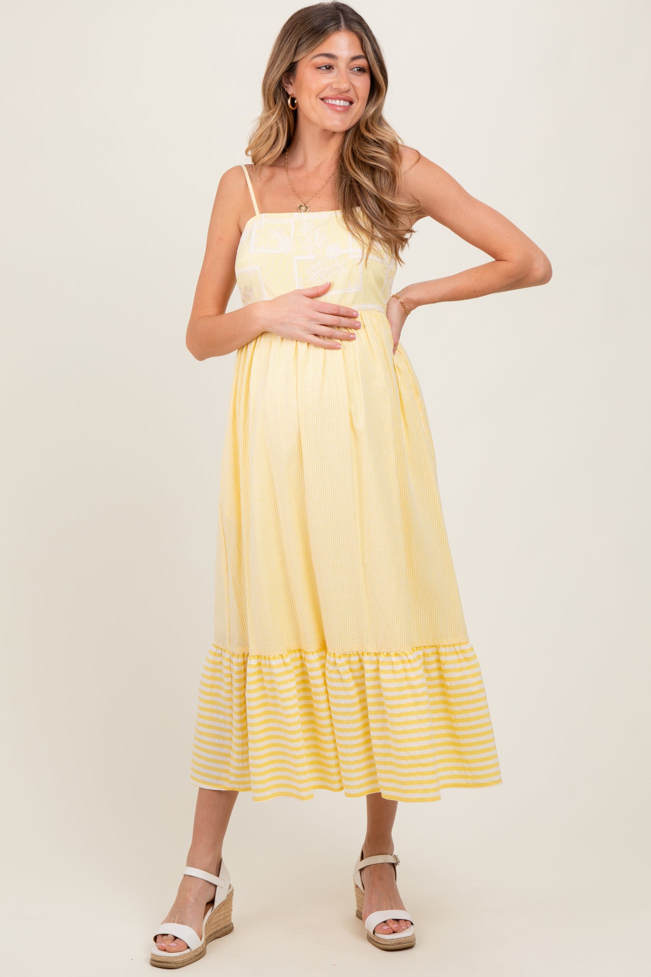 Yellow Embroidered Striped Colorblock Maternity Midi Dress