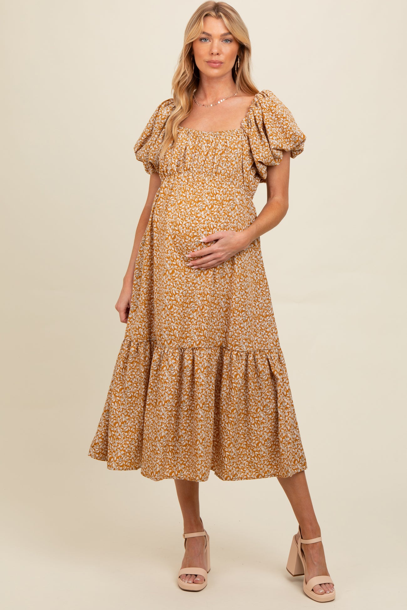 Yellow Floral Puffed Sleeve Maternity Midi Dress