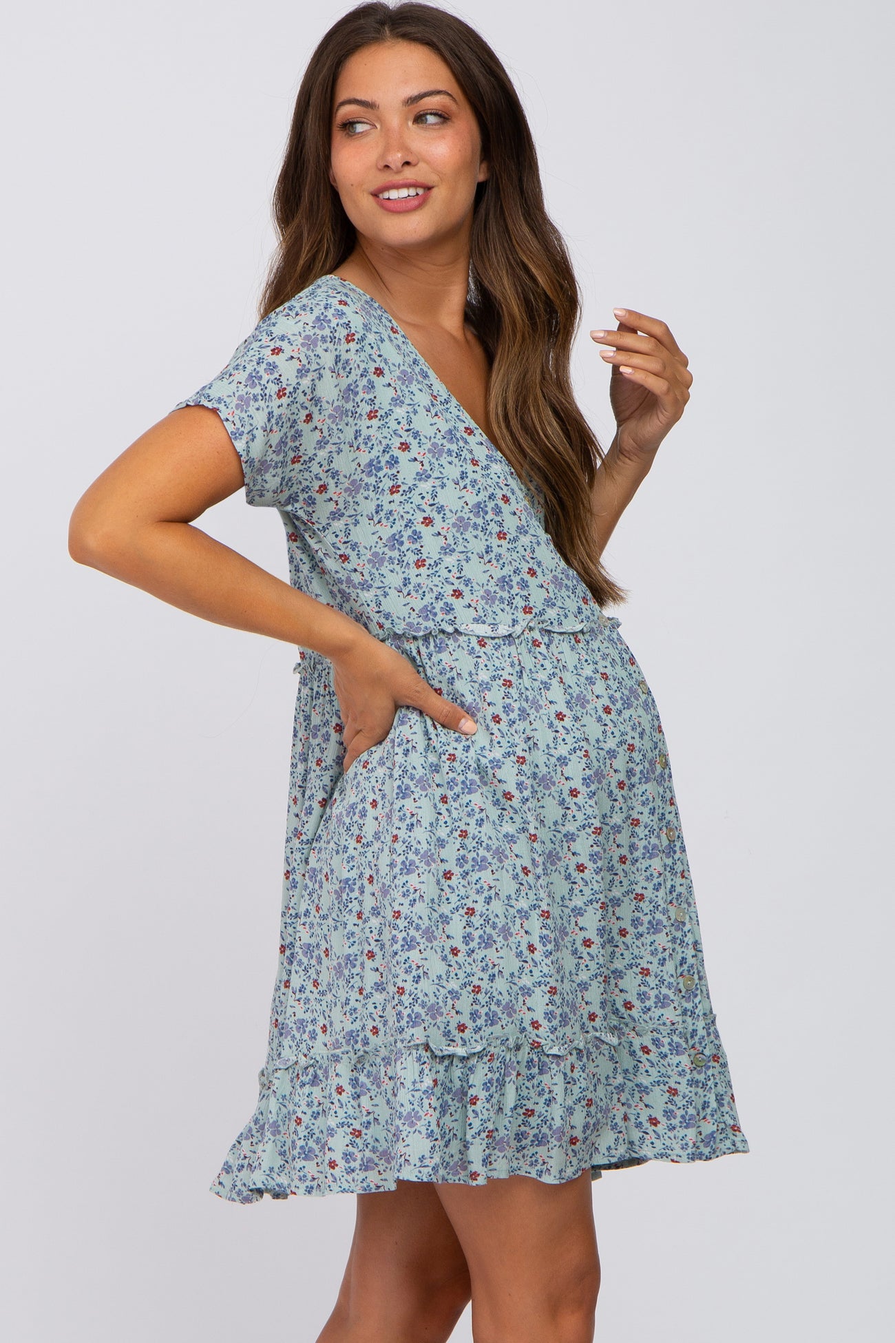 Aqua Floral Button Front Ruffle Hem Maternity Dress