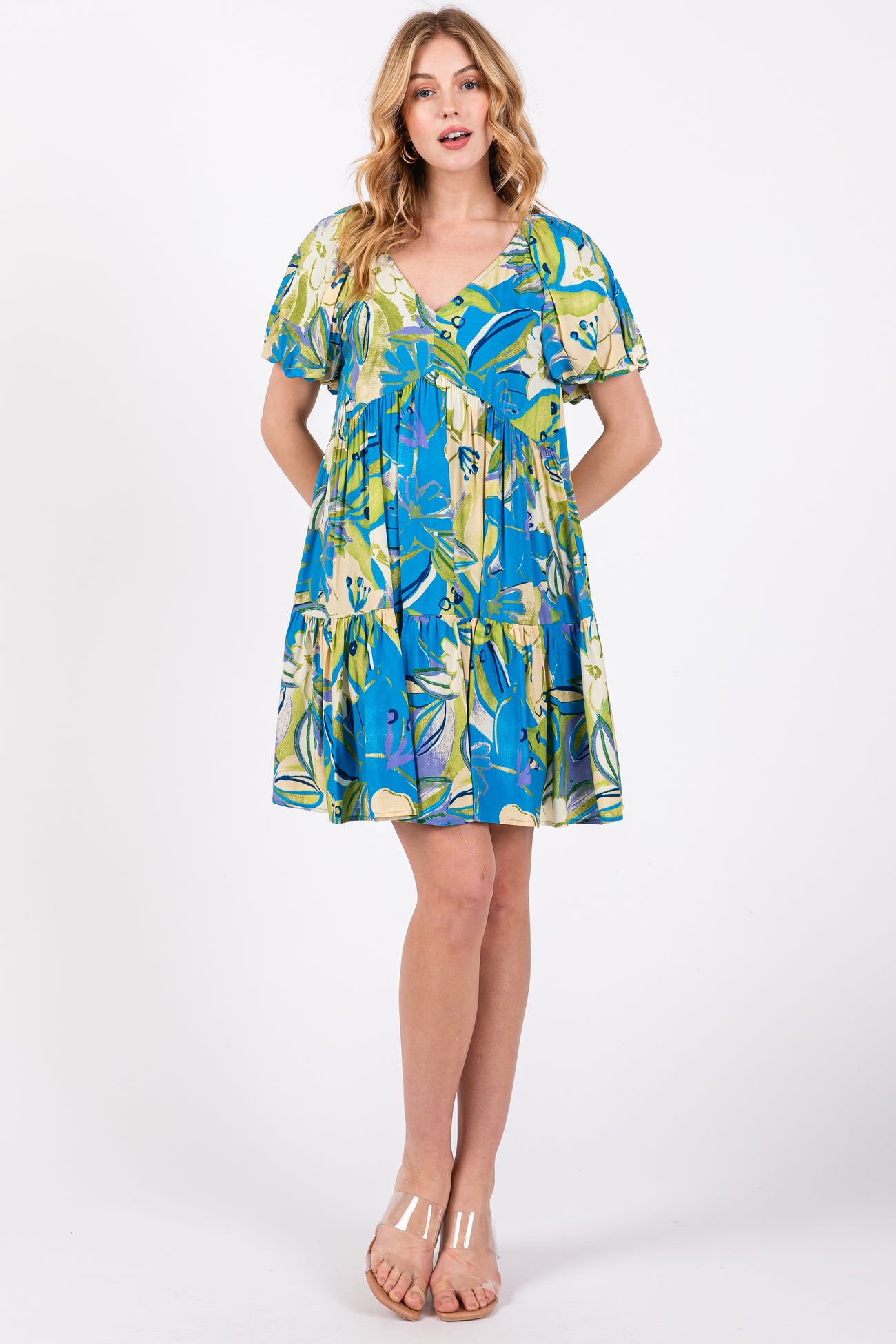 A floral print maternity dress featuring short puff sleeves, side pockets, a ruffle hem and a v-neckline.