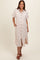 A solid hue maternity midi dress with a collar, front pocket, functioning front buttons, short dolman sleeves, side slits, and a rounded hem.