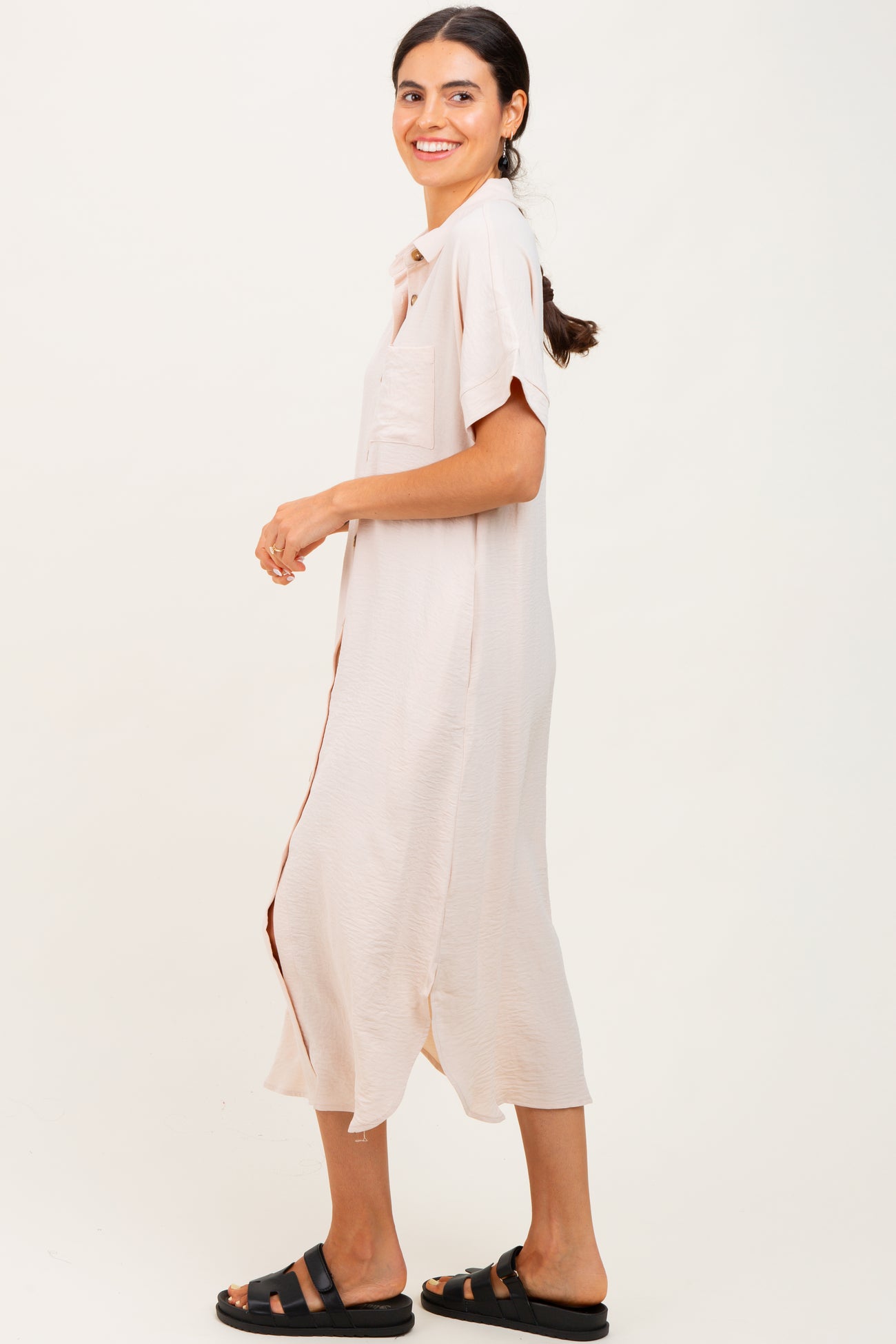 A solid hue midi dress with a collar, front pocket, functioning front buttons, short dolman sleeves, side slits, and a rounded hem.