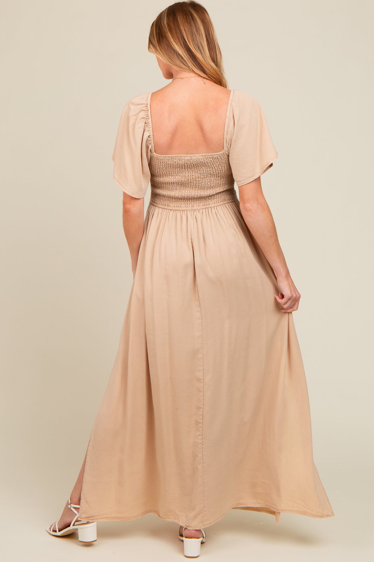 Embrace comfort and style with our Beige Chambray Smocked Maternity Maxi Dress. Crafted from soft, breathable chambray fabric, this dress features a flattering smocked bodice that stretches to accommodate your growing bump while providing gentle support. The elegant square neckline and flutter sleeves add a touch of feminine charm, perfect for any occasion. Designed with a flowy, ankle-length skirt and side slit, it offers ease of movement and a graceful silhouette. Ideal for maternity photoshoots, baby showers, or everyday wear, this versatile dress promises all-day comfort with a chic look. Available in neutral beige for timeless appeal.
