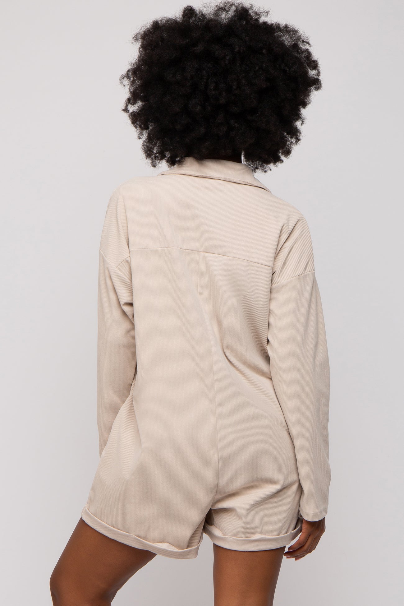 A corduroy romper with front functioning buttons, a collar, long drop shoulder sleeves, front pockets, and a cuffed hem.