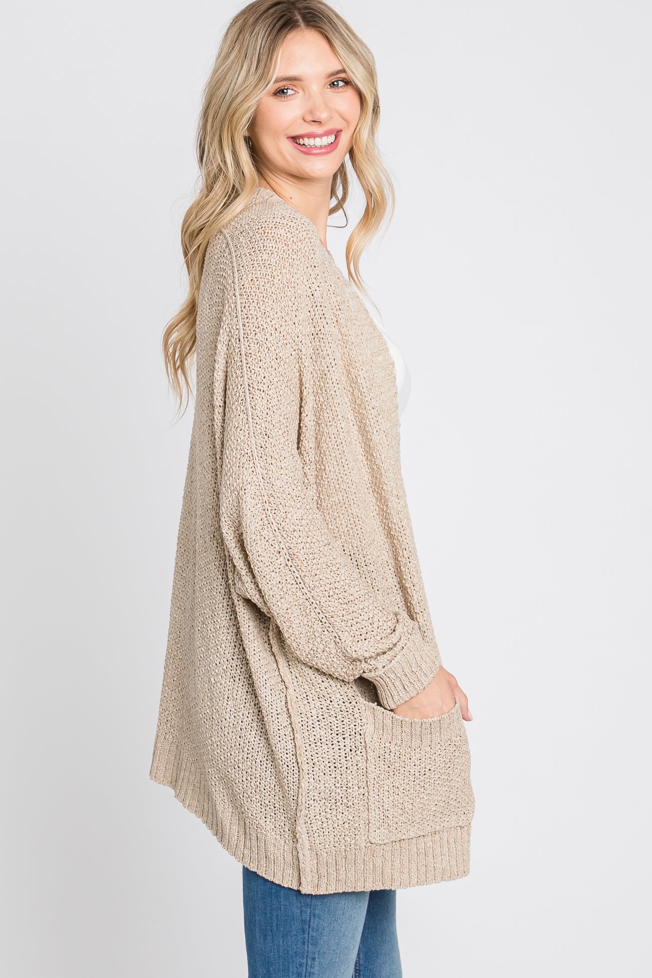A cardigan featuring front pockets, an open front and dolman cuffed long sleeves.