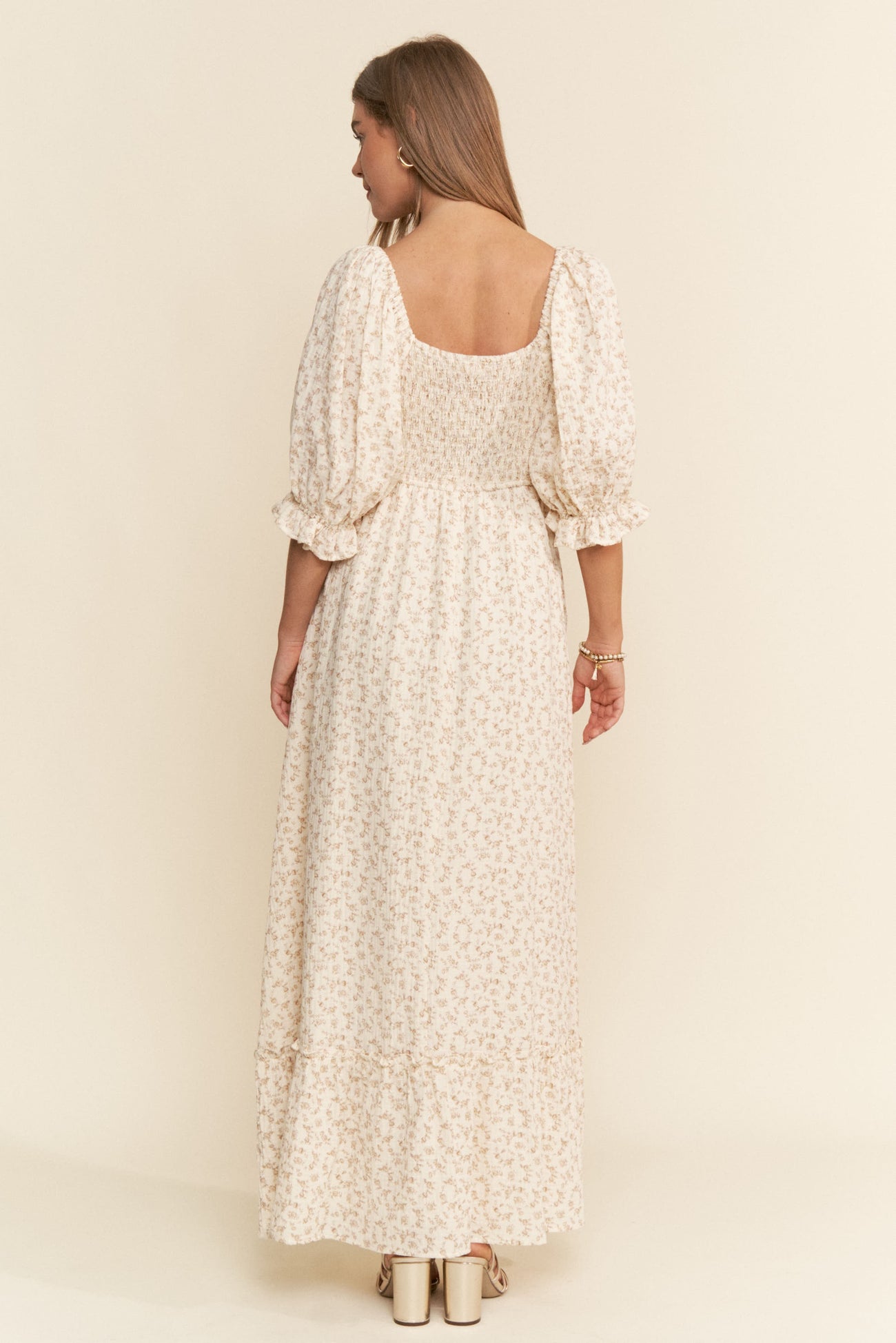 Embrace effortless elegance with our Beige Floral Print Square Neckline Maxi Dress. This lightweight, flowy dress features a flattering square neckline and charming puff sleeves with delicate ruffle details at the cuffs. The subtle beige floral pattern adds a touch of timeless romance, perfect for both casual outings and special occasions. The cinched waist enhances your silhouette while the ankle-length hem offers graceful movement. Pair with strappy sandals and gold accessories for a complete look. Ideal for spring and summer days, this maxi dress combines comfort and style effortlessly.