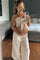 A maternity set with a crop top and wide leg pants. The smocked crop top features an adjustable front tie, and the pants have an elastic waistband and side pockets.