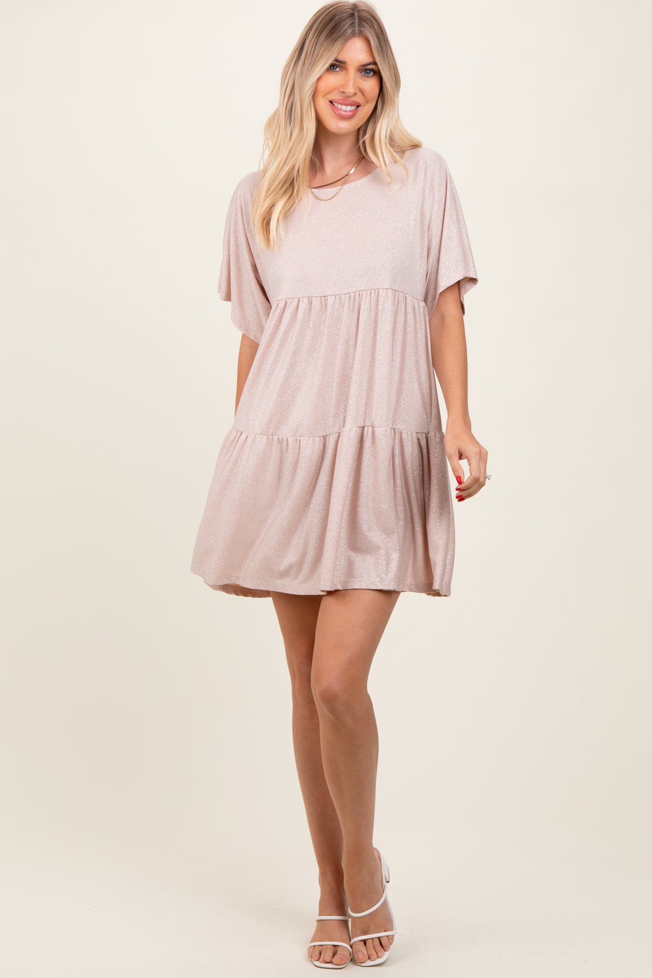 Shine bright in this Beige Glitter Flutter Sleeve Tiered Dress, perfect for adding a touch of sparkle to your wardrobe. Featuring soft flutter sleeves and a flattering tiered silhouette, this dress offers a breezy, feminine fit ideal for daytime outings or evening events. The subtle glitter fabric adds just the right amount of shimmer for a chic, elegant look. Pair it with strappy heels or sandals for effortless style. Comfortable, stylish, and versatile, this dress is a must-have for those who love a little shimmer with their sophistication. Available in multiple sizes.