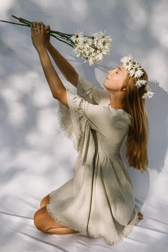 Beige Raw Edge Bell Sleeve Babydoll Dress