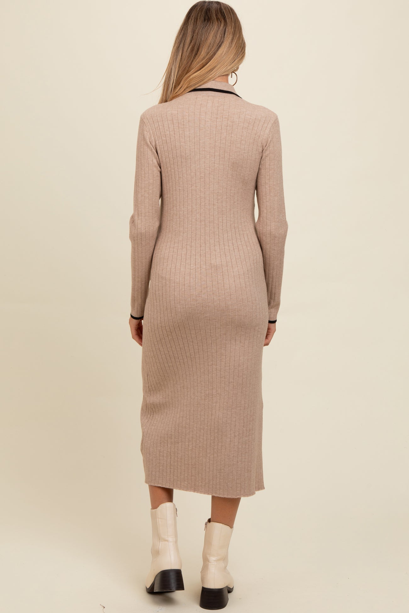 Beige Ribbed Contrast Trim Polo Maternity Midi Sweater Dress