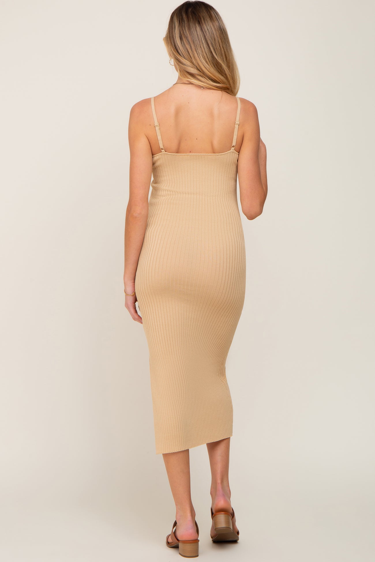 Beige Ribbed Knit Side Slit Maternity Midi Dress