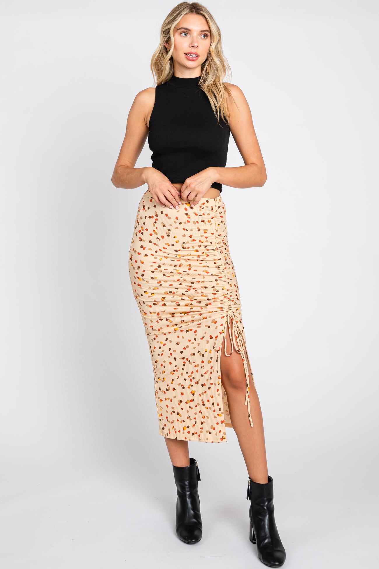 Beige Ribbed Side Slit Drawstring Maternity Midi Skirt