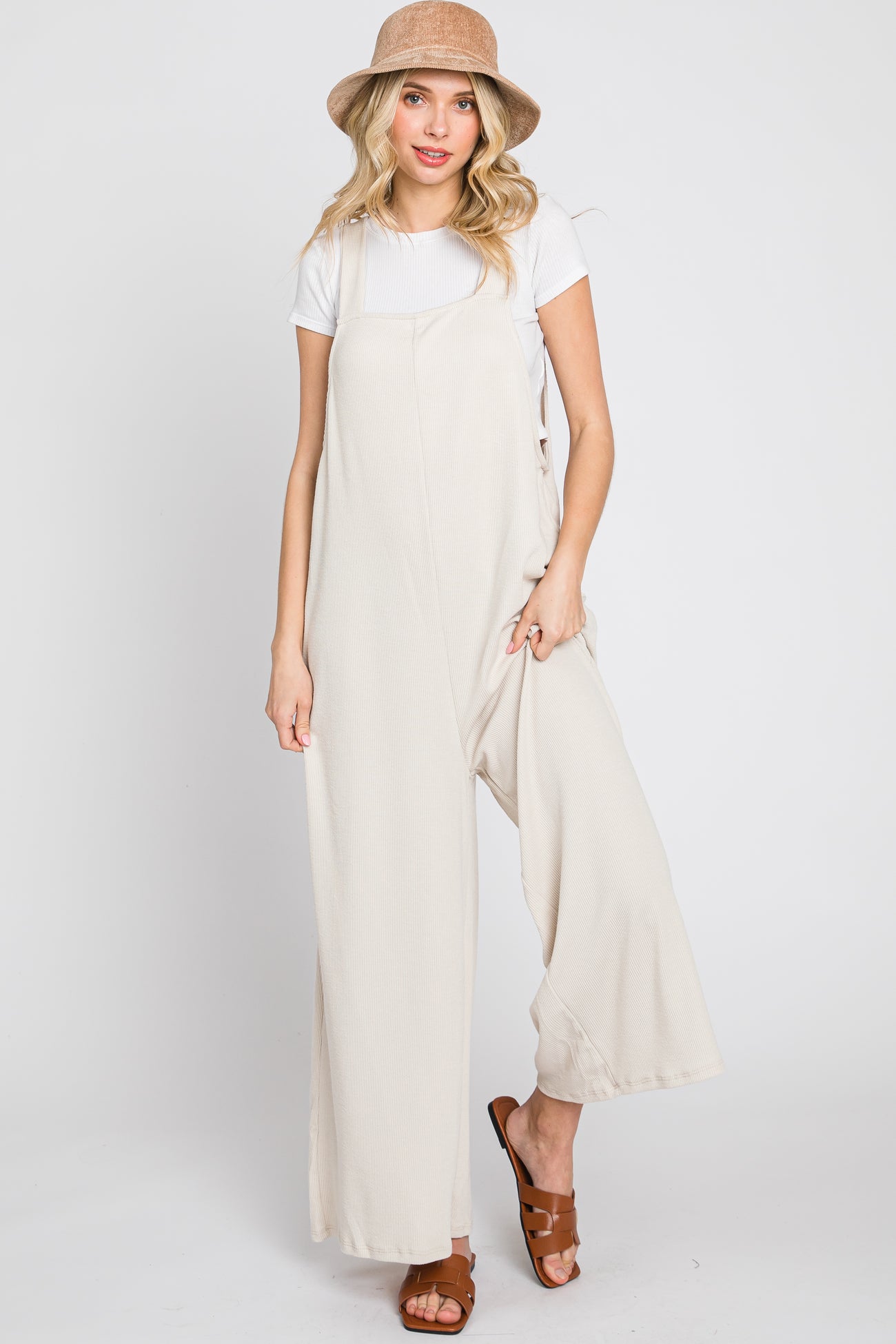 Details A solid ribbed jumpsuit in a wide leg style. Pocketed. Content + Care