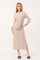 A solid rib knit midi dress featuring a rounded neckline, long sleeves, ruched sides, and a side slit.