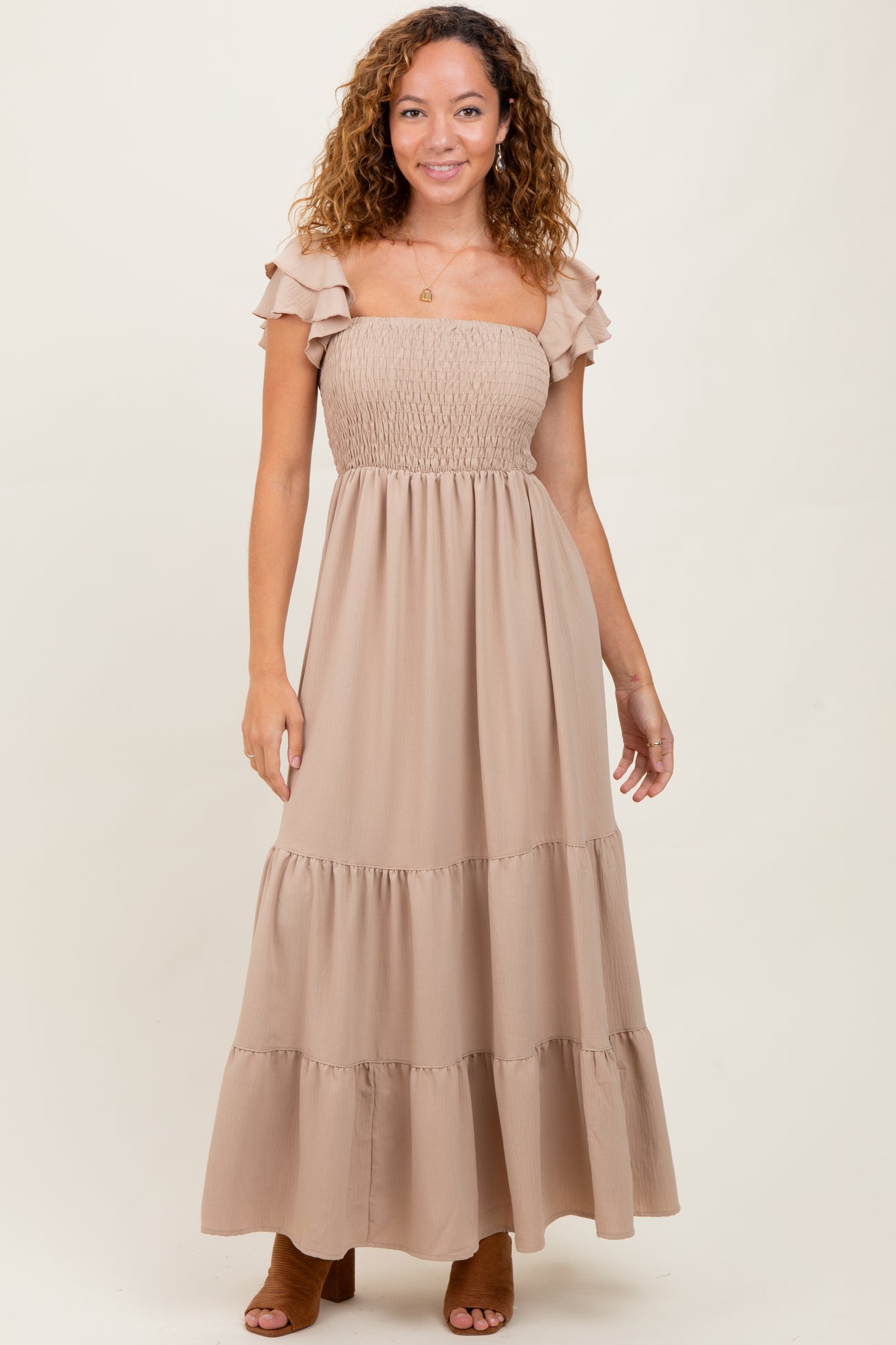 Beige Smocked Ruffle Off Shoulder Tiered Maternity Maxi Dress