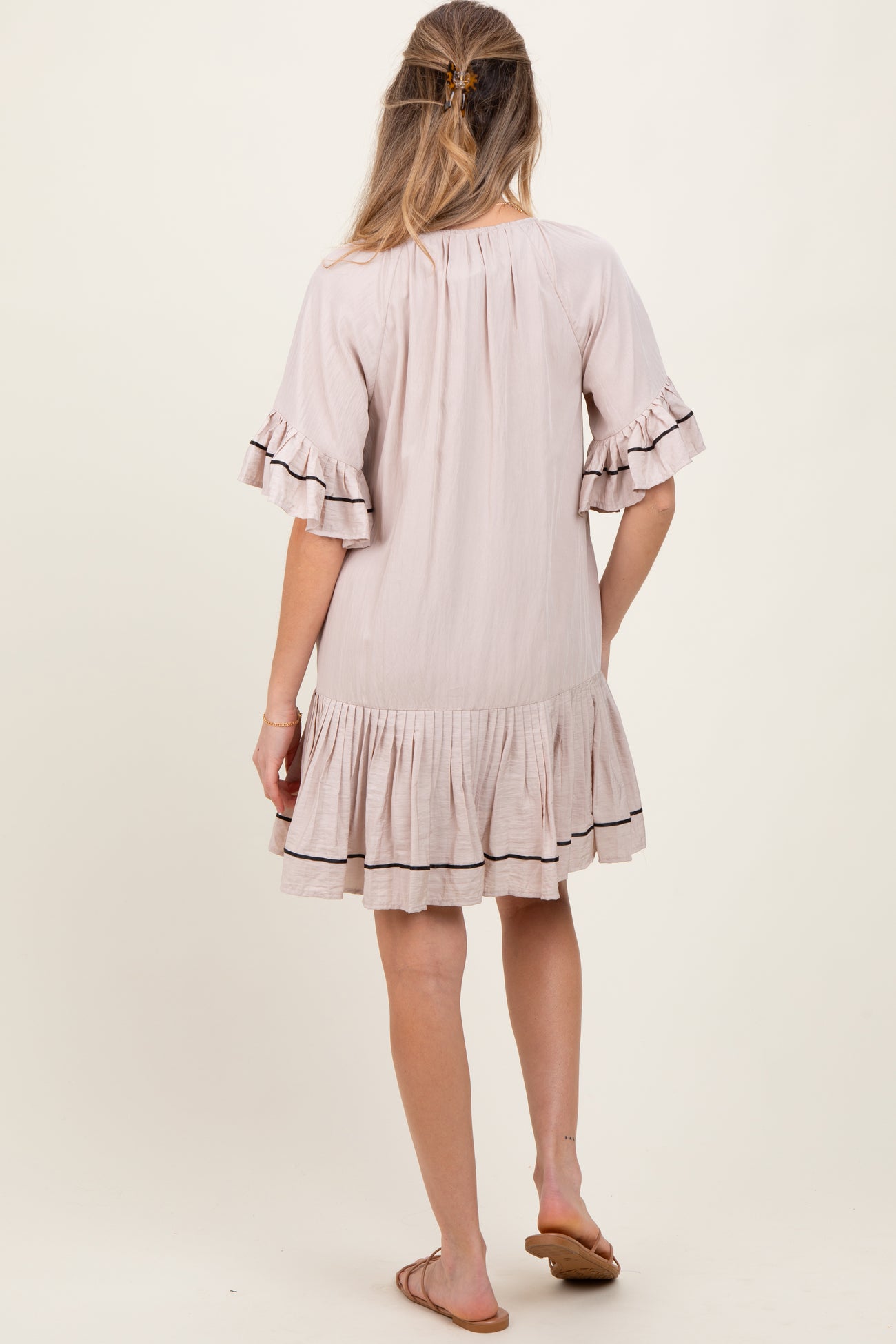 Beige Solid Short Sleeve Pocketed Maternity Dress