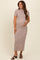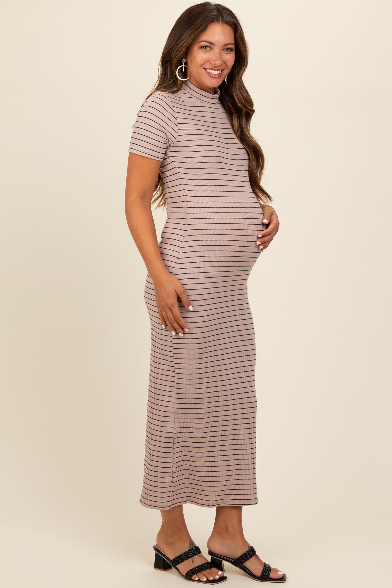 Beige Striped Mock Neck Fitted Maternity Midi Dress