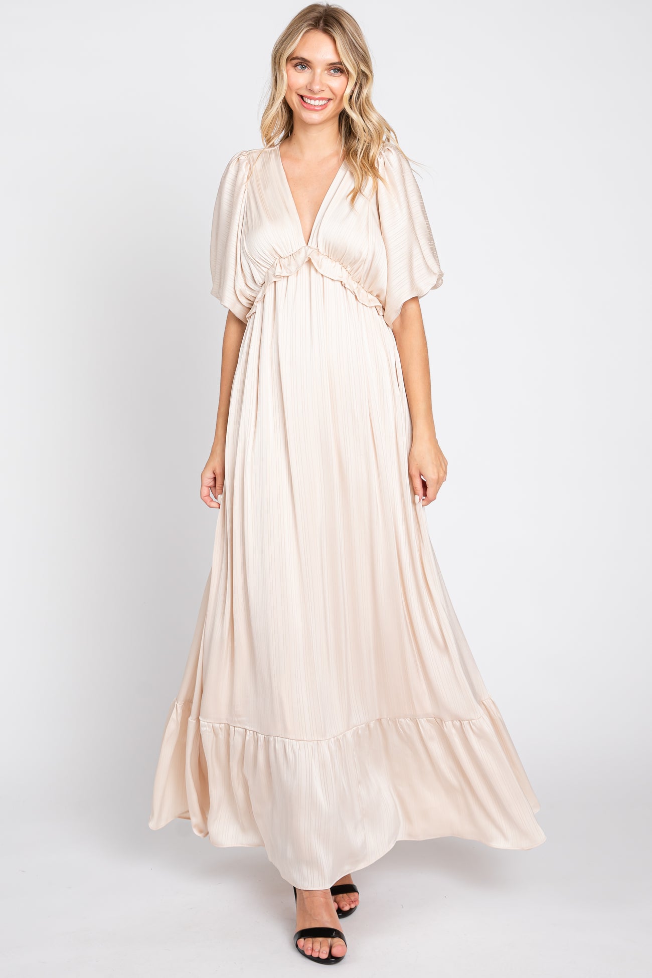 Beige Striped Ruffle Accent Maternity Maxi Dress