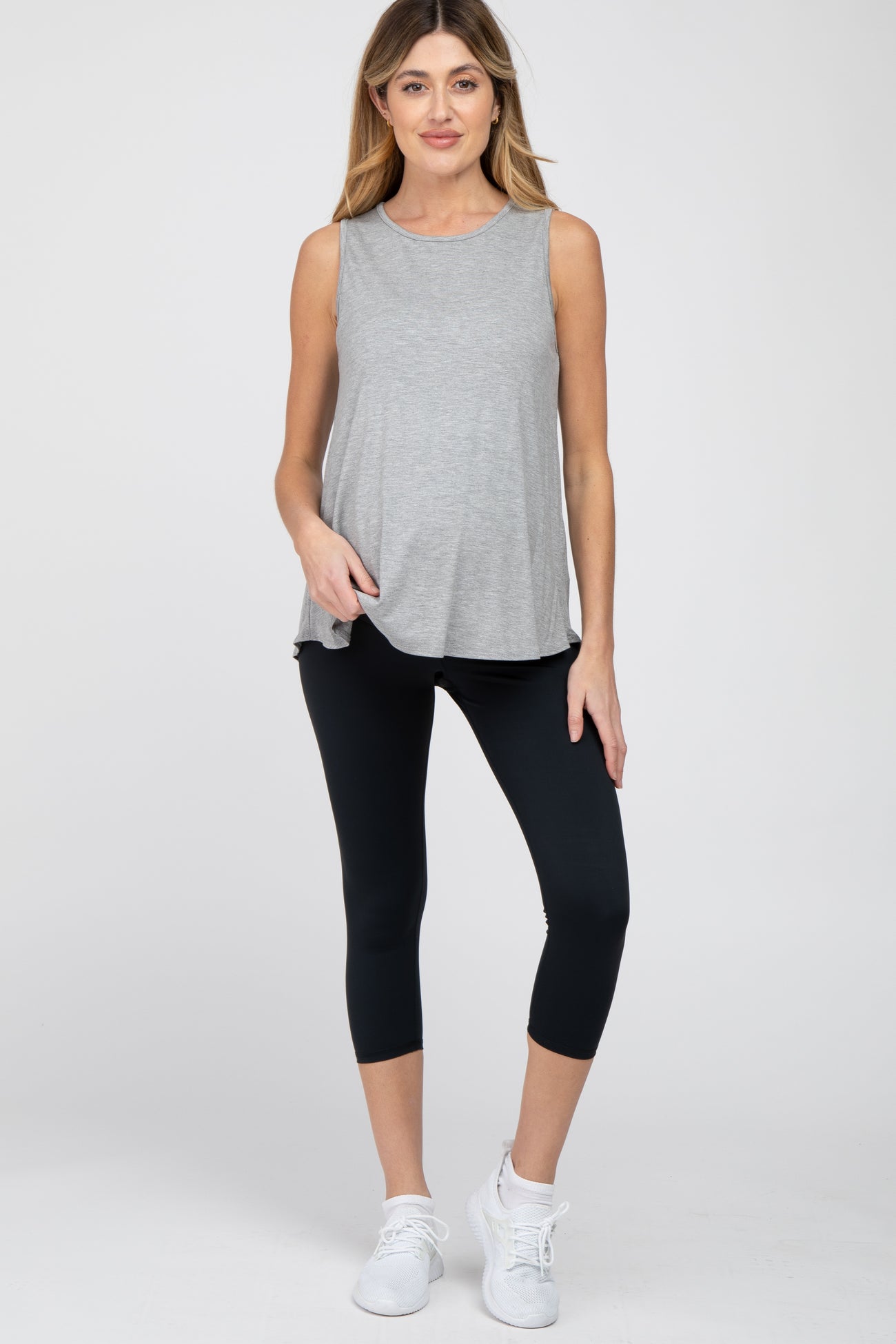 A solid basic maternity active capri with a full panel elastic belly band. Material has high stretch.