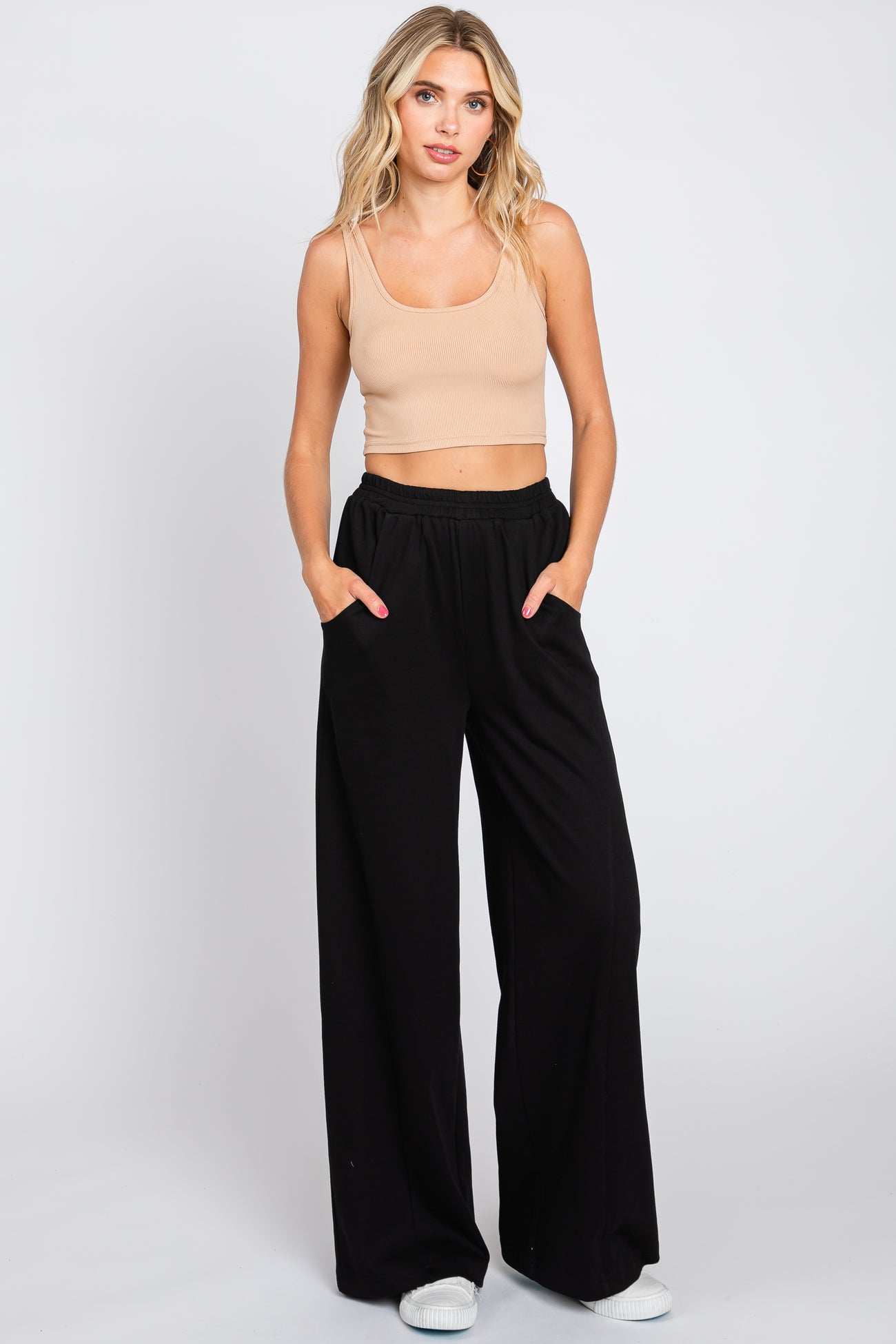 A solid pair of wide leg pants with an elastic waistband. Pocketed.