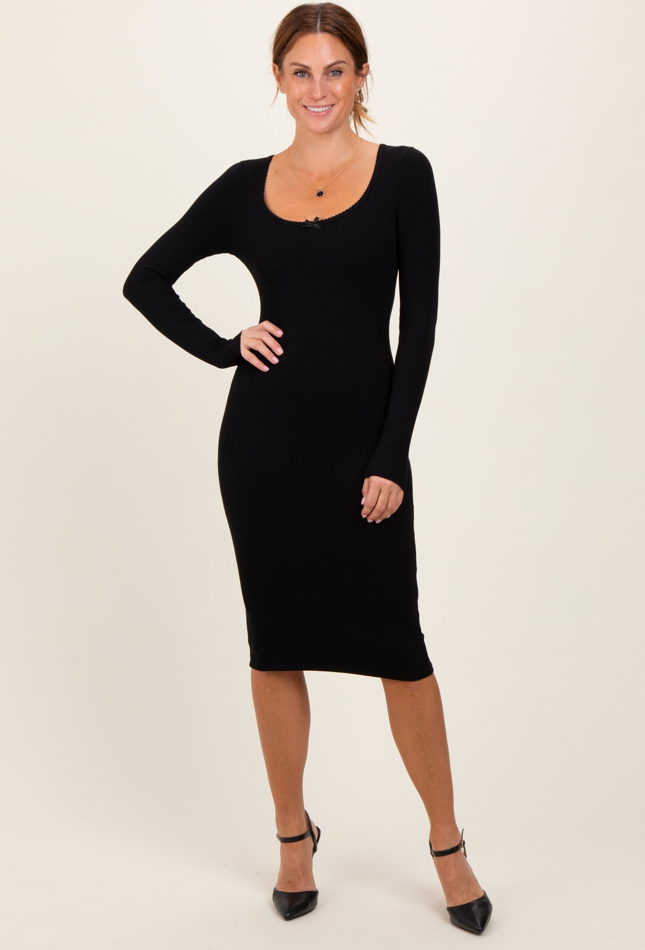 Black Bow Trim Neckline Long Sleeve Midi Dress
