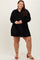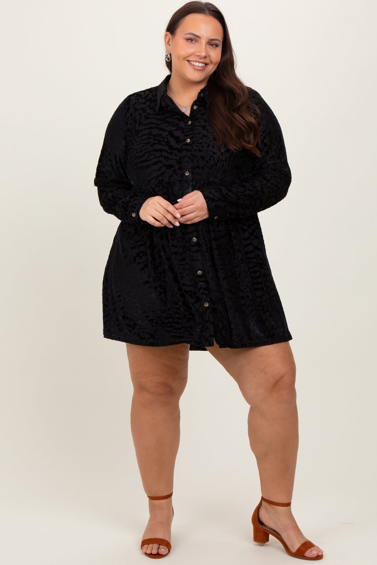 A burnout velvet plus size dress featuring a collar, front functioning buttons, and long cuffed sleeves. The body of the dress is lined.