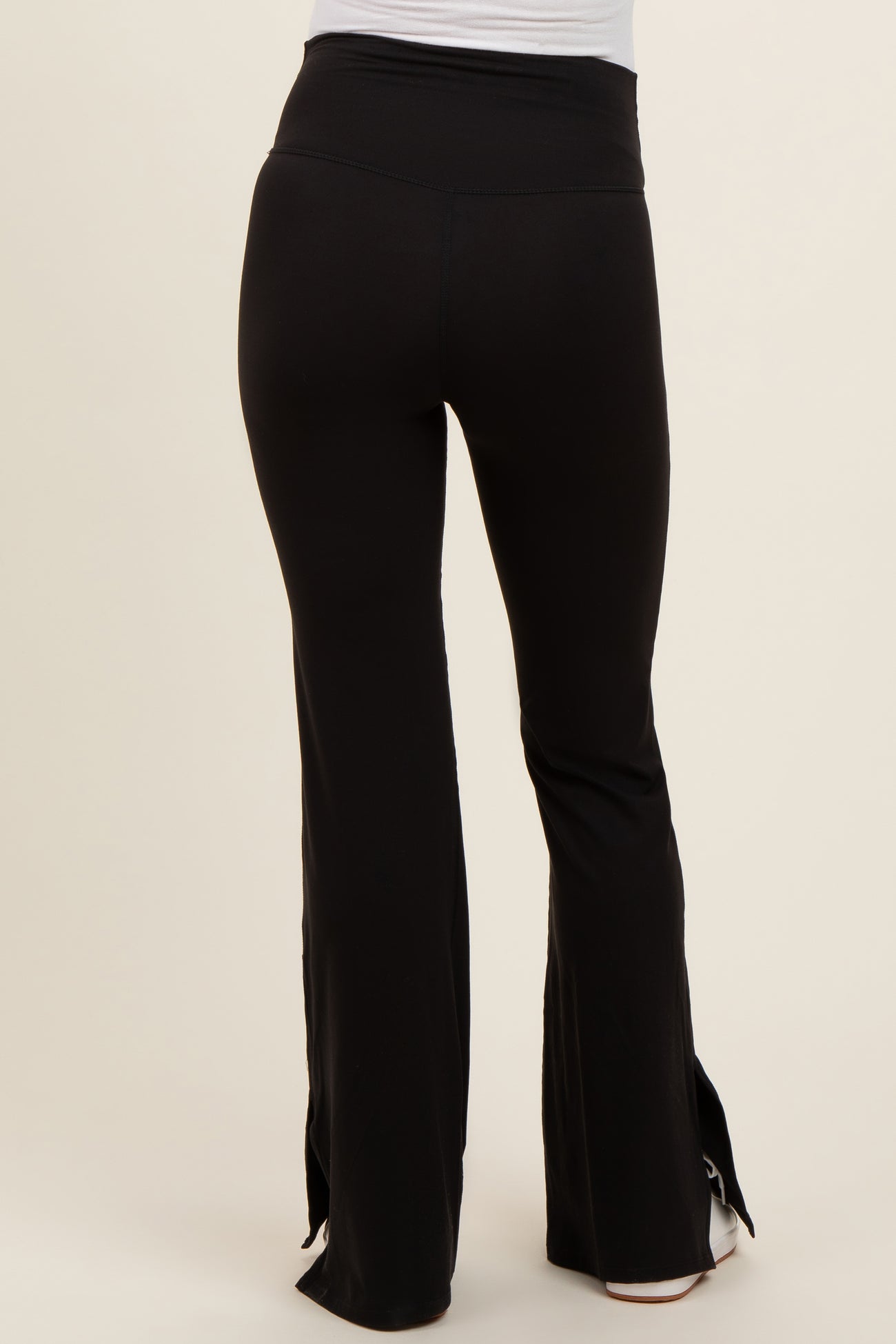 A pair of soft, solid maternity leggings with a crossover overlap waist accent, side pockets, and flared legs.