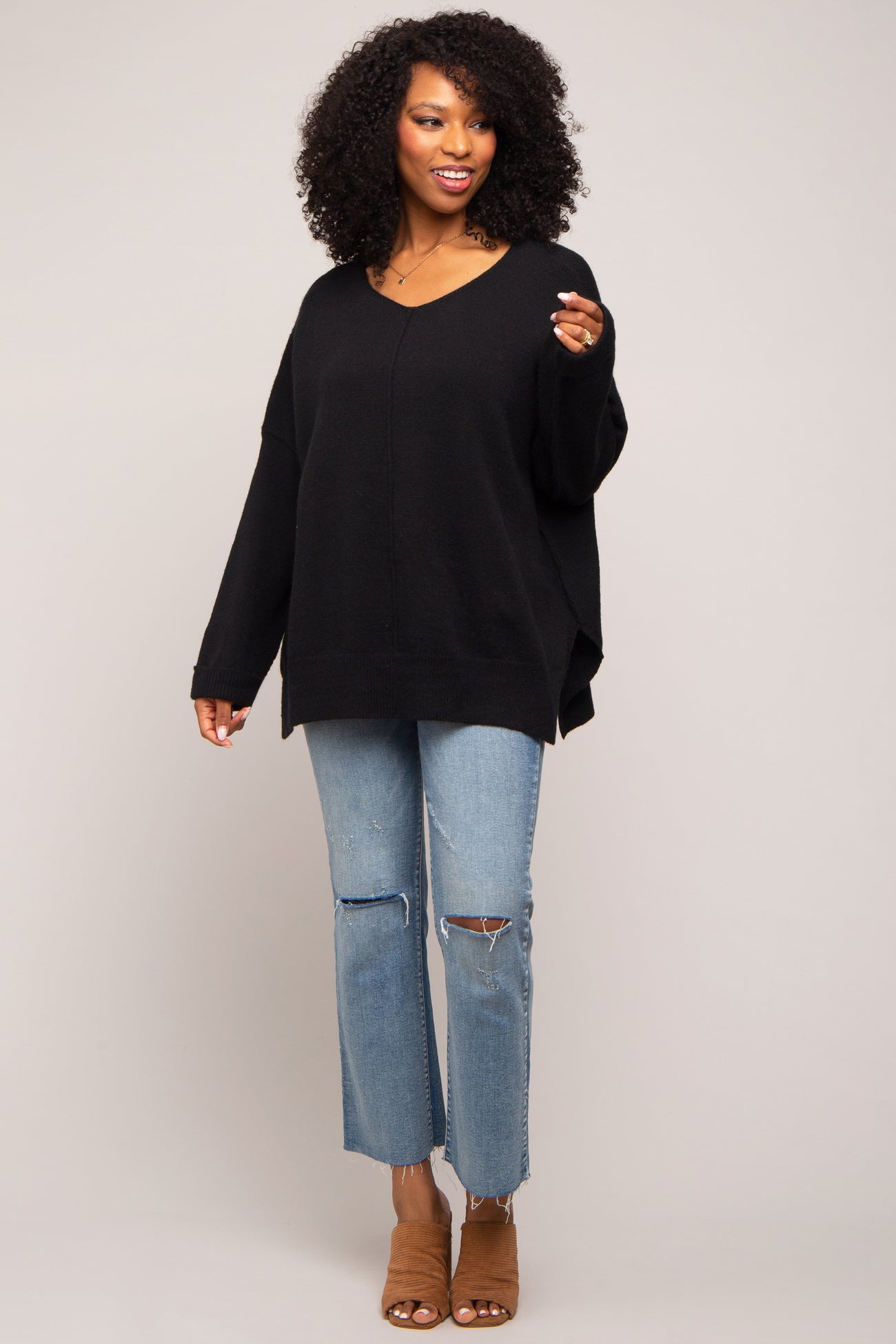 A solid long sleeve sweater with dolman sleeves and two small side slits.