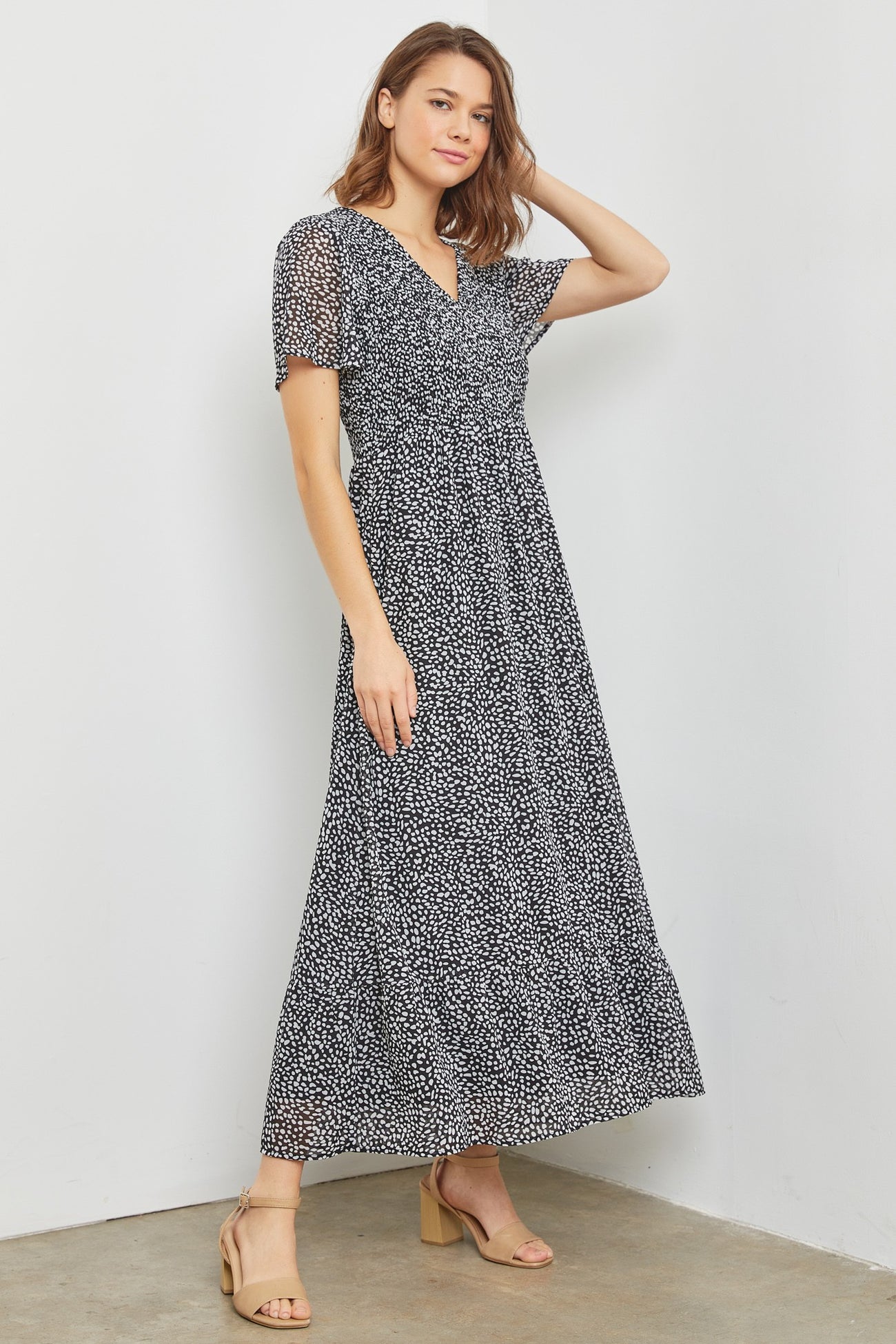 Black Dotted Smocked V-Neck Short Sleeve Maxi Dress