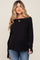 A solid maternity top with long raglan sleeves, a rounded neckline, and a rounded hi-lo hem. Seams are exposed with raw hems.
