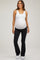 A pair of active maternity pants featuring an elastic belly band and flared pant legs.