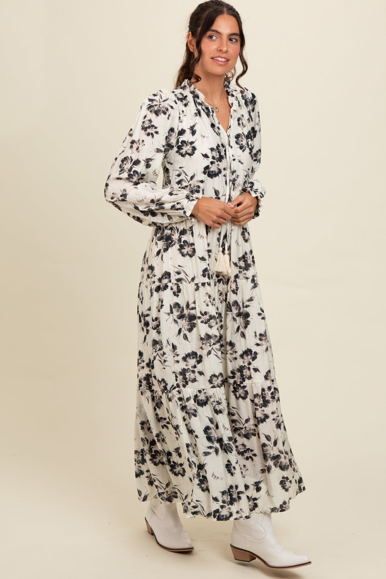 Black Floral Button Front Tiered Long Sleeve Maxi Dress