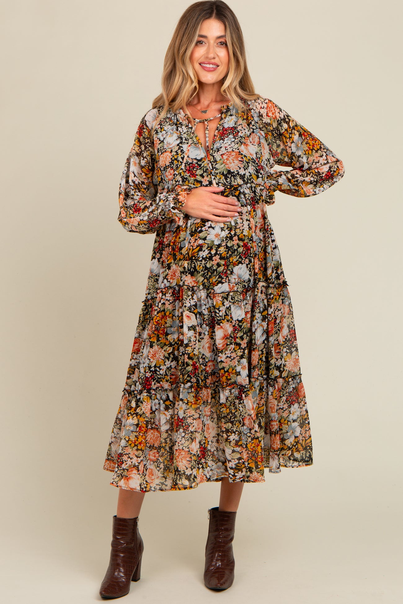 Black Floral Chiffon Front Tassel Tie Maternity Midi Dress