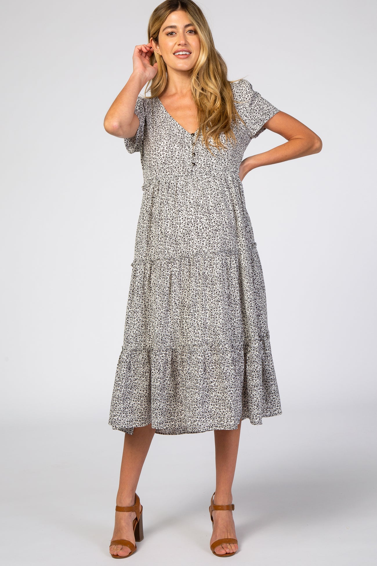 Details A floral print chiffon maternity midi dress featuring a v-neckline, short ruffle sleeves, a button front, an empire waist and pleated tiers with ruffle trim. Double lined. This style runs big. Content + Care