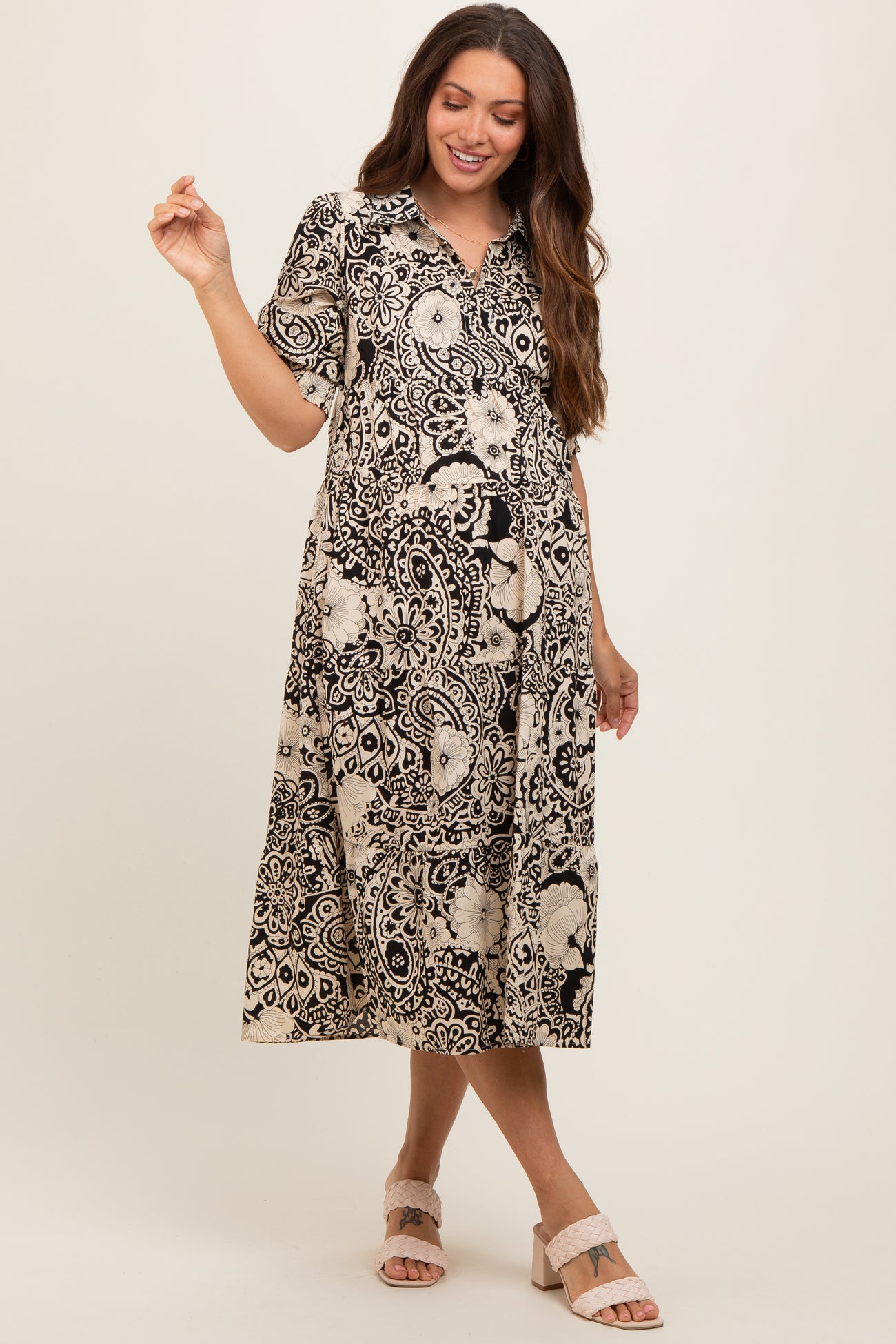 A floral maternity midi dress featuring short sleeves, a split v-neckline, a collar, and a tiered skirt.