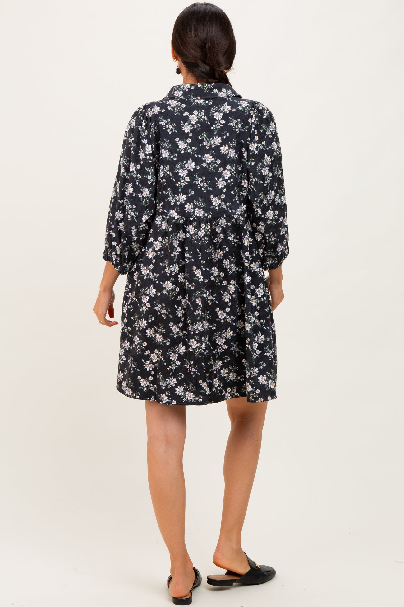 Elevate your everyday style with our Black Floral Corduroy Button Down Shirt Dress. Crafted from soft, textured corduroy, this dress features a delicate all-over floral print that adds a touch of feminine charm to a classic silhouette. The button-down front and collared neckline offer timeless appeal, while the gathered waist creates a flattering, relaxed fit. With three-quarter sleeves and a knee-length hem, it's perfect for layering or wearing alone. Ideal for casual outings or cozy days, this versatile dress combines comfort and style effortlessly. Your new go-to piece for any season!