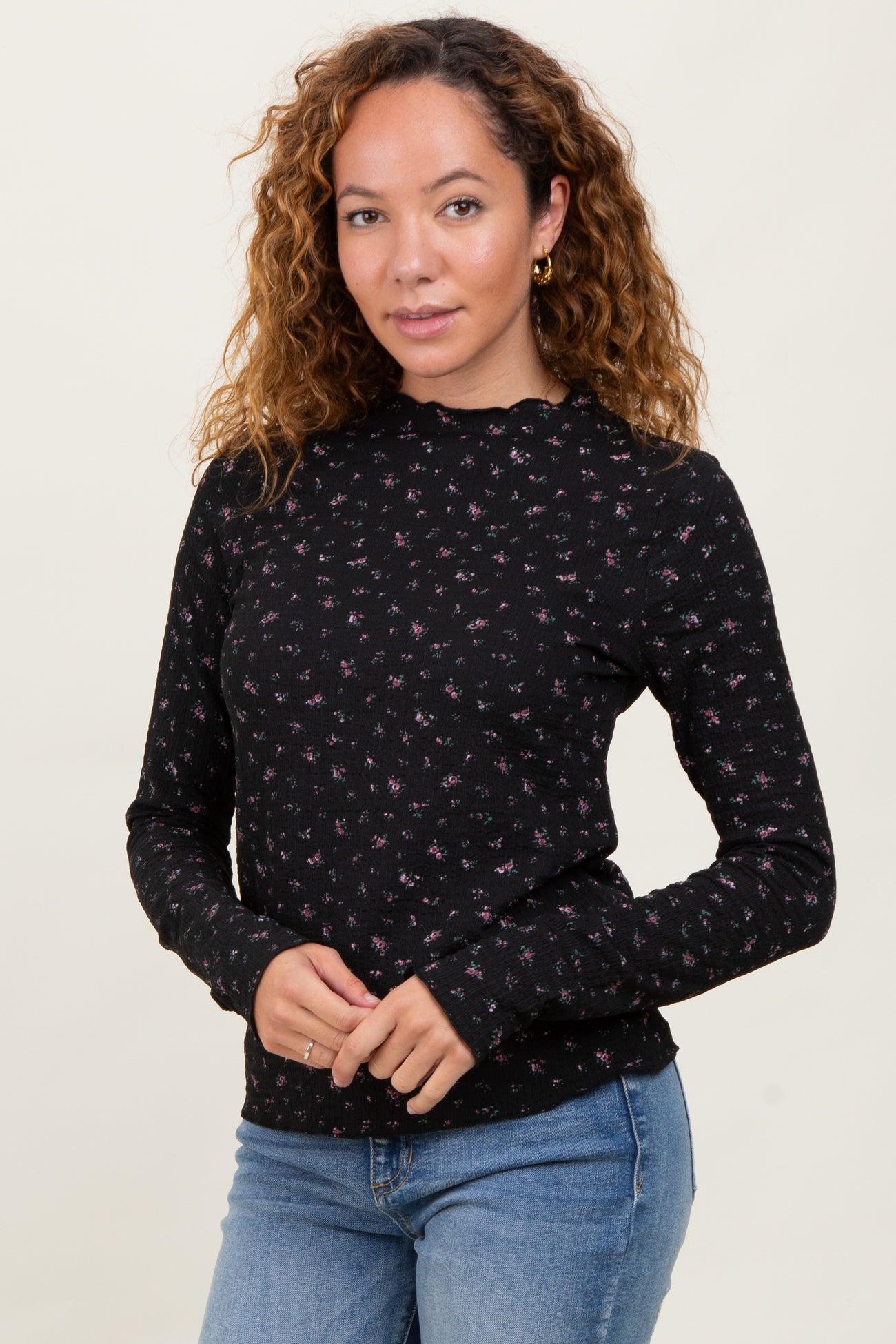 Stay stylish and comfortable throughout your pregnancy with our Black Floral Crinkled Texture High Neck Maternity Long Sleeve top. Featuring a delicate all-over floral print on a soft crinkled fabric, this top offers a flattering high neck design and gentle stretch to accommodate your growing bump. The long sleeves provide extra coverage for cooler days, while the fitted silhouette ensures you feel both cozy and chic. Perfect for everyday wear or dressed up for special occasions, this maternity top is a versatile addition to your maternity wardrobe. Pair it with your favorite jeans or leggings for effortless pregnancy style.