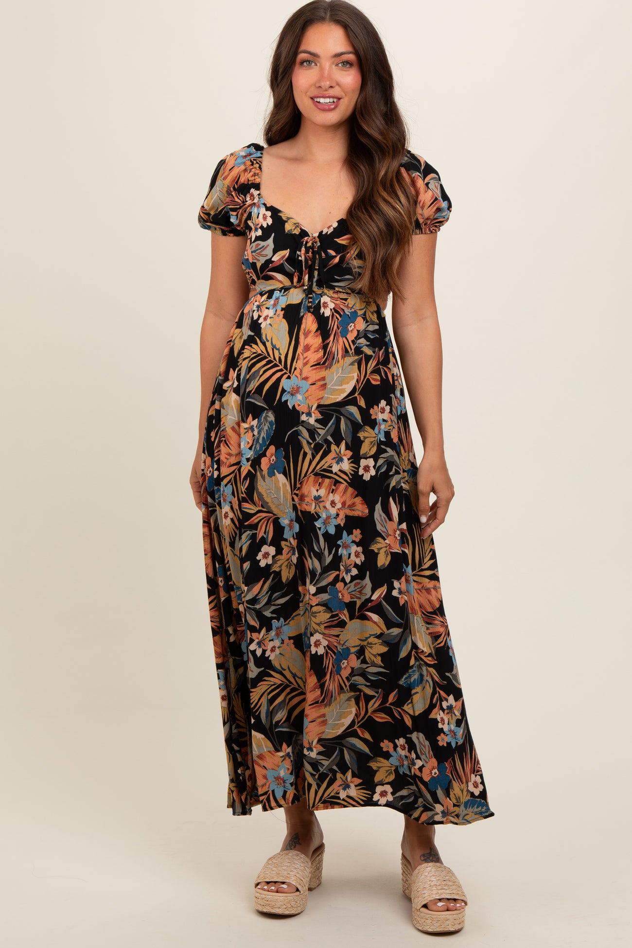 Black Floral Drawstring Front Side Cutout Maternity Maxi Dress