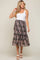 A plisse, floral print maternity midi skirt. Features an elastic waistband, partial lining ,and a ruffle accent bottom tier.
