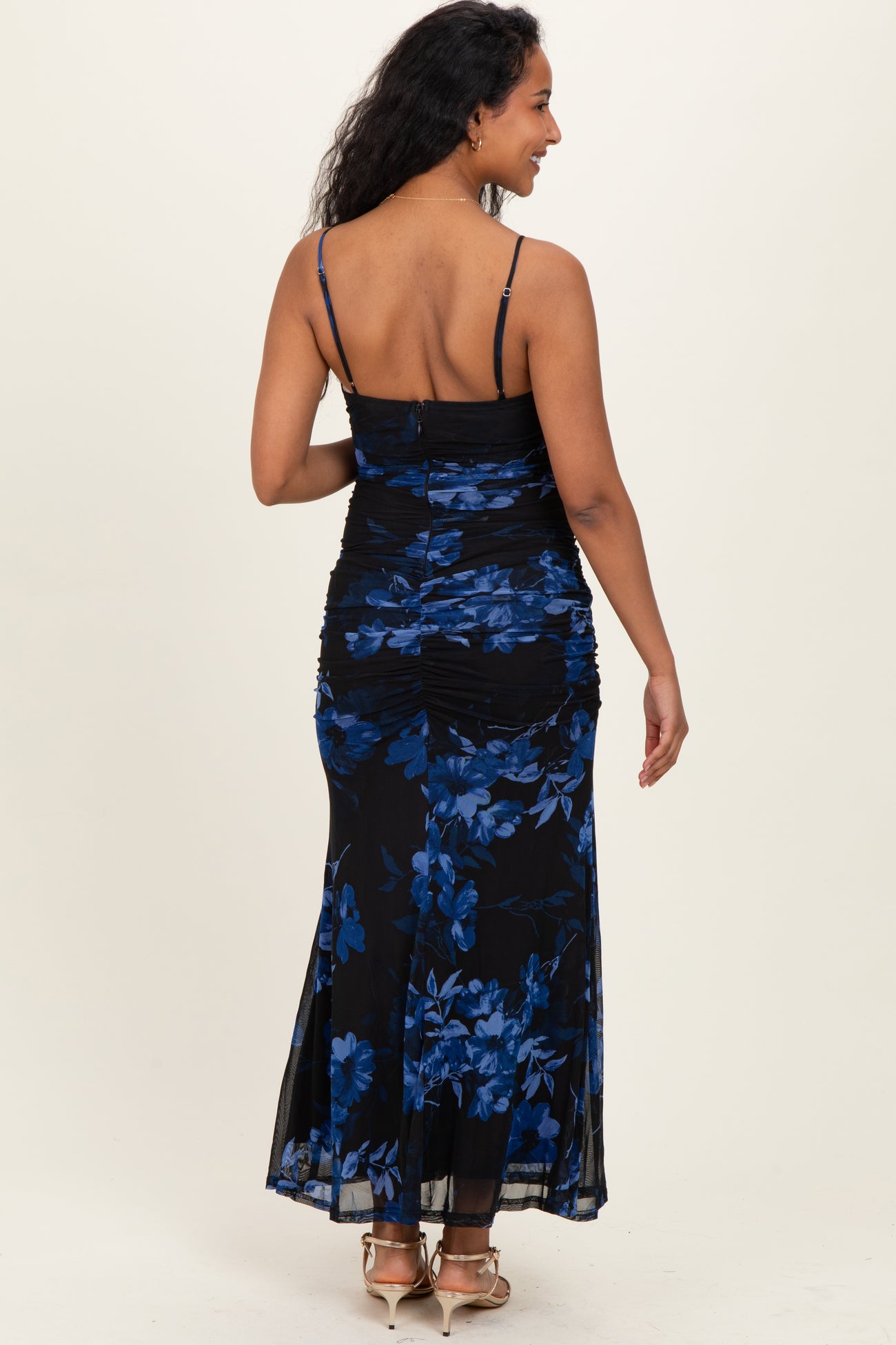 Black Floral Ruched Mesh Maternity Maxi Dress