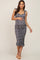 A ribbed knit, floral printed maternity midi dress featuring a v-neckline, ruched front, back and sides and adjustable tie straps.
