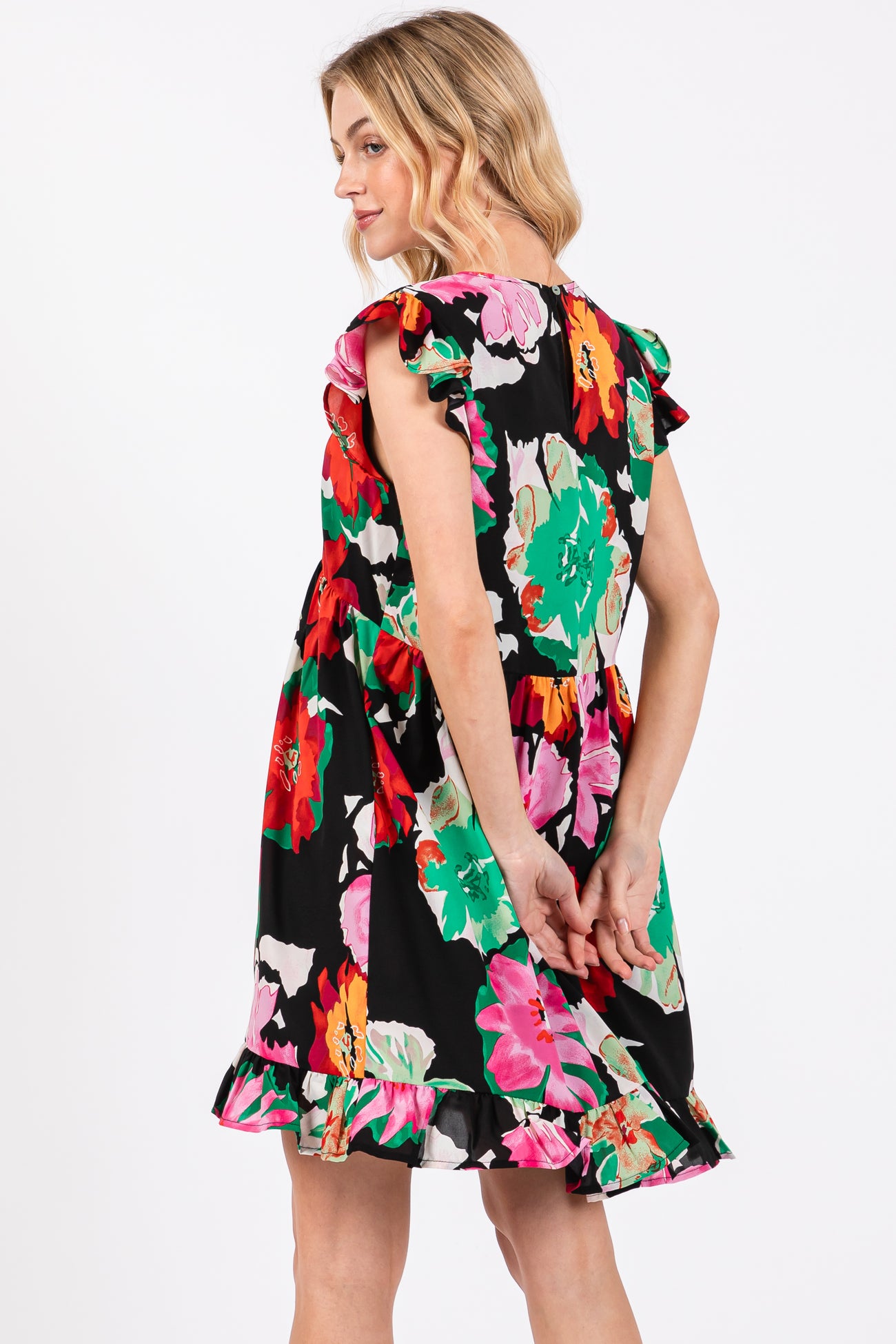 Details A floral print dress featuring a v-neckline, ruffle shoulders, a keyhole back with a button closure, an empire waist, a ruffle hem, and double lining. Content + Care